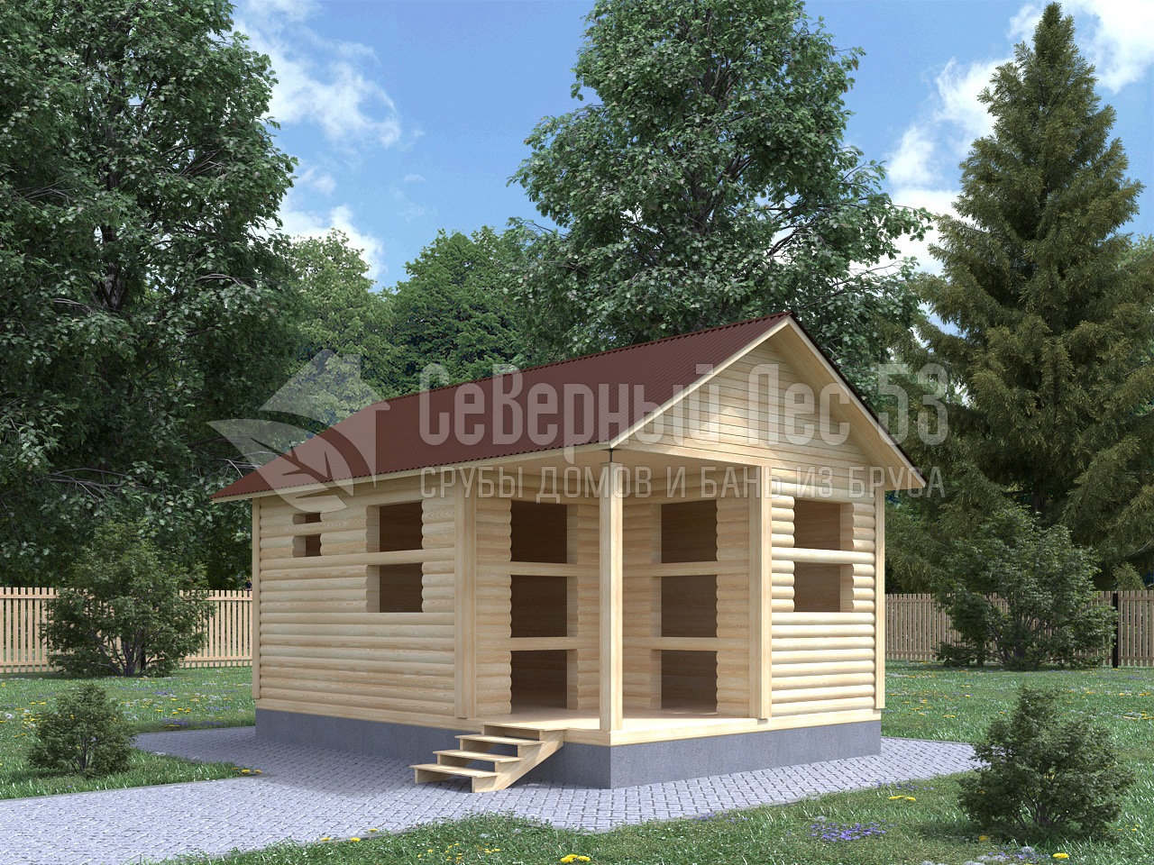 Профилированный брус 90×140; 140×140 мм или 190×140 мм (естественной влажности), с наружной стороны прямой или под блок-хаус, с внутренней — прямой.